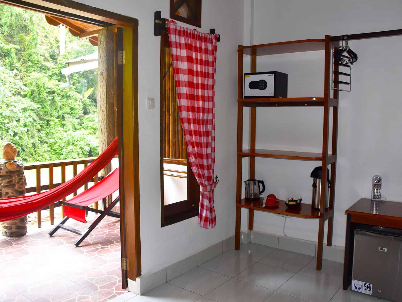 Our panoramic Orangutan Room offers fantastic front views of the jungle from an upstairs position. The big balcony with hammock is perfect for relaxing, the door opens up to “mother nature’s doorstep”. The private 4 meter bathroom has a western toilet, hot water shower, soap, shampoo, toothbrush and hair-dryer. There’s a safe locker and a fridge, you will also find tea and coffee making facilities as well as water with our complimentary items, along with a mosquito net. A fresh breeze from the Bohorok River and the neighbouring Gunung Leuser National Park is funnelled into the room – further propelled by the ceiling fan. Our Orangutan Room offers a comfortable 30 square meters of living space.